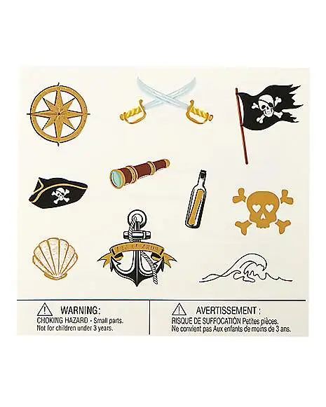 Ahoy! Set sail on your next adventure and complete your pirate costume with these Pirate Temporary Tattoos! This set includes 20 temporary tattoos, including skulls, flags, treasure maps, and more, sure to make you the height of seafaring style.