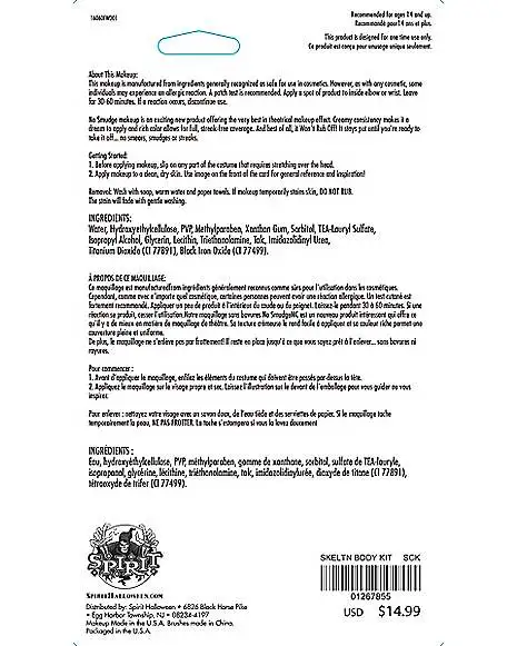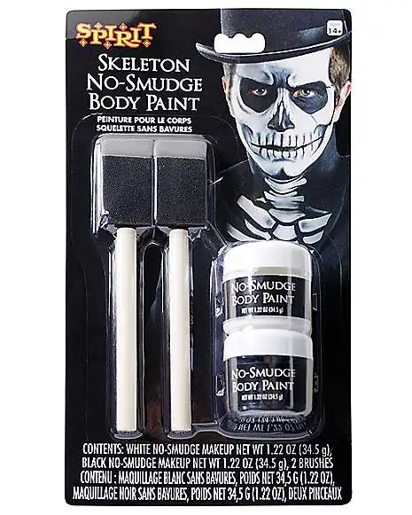 Get ready to truly transform this Halloween with this Skeleton Body Paint Kit! The skeleton kit includes both white and black no-smudge paint and application brushes for the perfect deadly look.