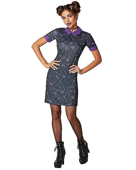 Show up to the Halloween party looking stylish and in the spirit with this Spooky Collar Dress. This stylish dress features different Halloween-themed prints all over and is the perfect choice for any spooky celebration.