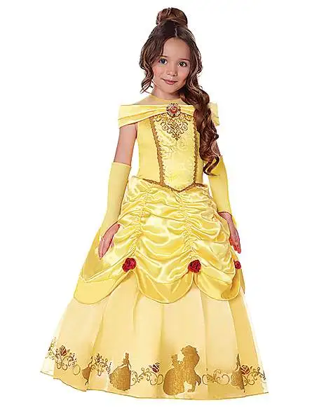 Your little one will warm the hearts of beasts and beauties alike in this stunning Belle costume! This officially licensed Beauty and the Beast costume features a long yellow gown with a soft luster. An off-the-shoulder bodice meets a full skirt topped with thoughtfully draped ruching. Delicate silhouette artwork lines the bottom of the skirt for the perfect finishing touch. Yellow fingerless gloves bring the polished look to completion!